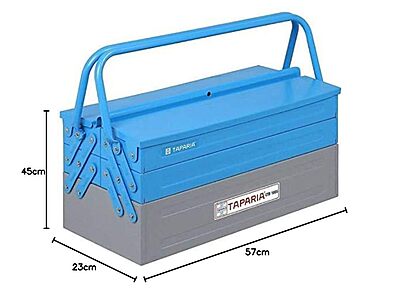 The TAPARIA Cantilever Tool Box (Model: CTB 1803) is a sturdy and spacious metal toolbox with 3 compartments, designed to efficiently organize and transport tools. Its cantilever design ensures quick access to all compartments simultaneously, making it ideal for technicians, electricians, and workshop professionals.