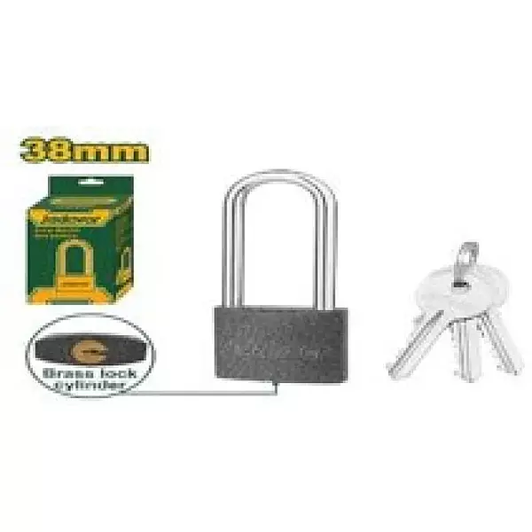 Long lock beam Size:38mm Weight:144g Lock body material: iron Brass lock cylinder With 3 pcs iron keys Packed by color box