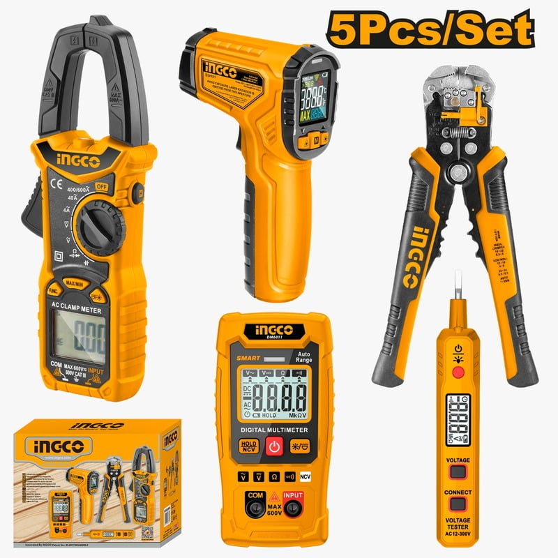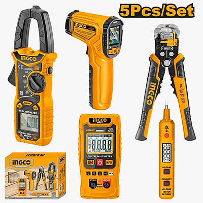 The INGCO Electrical Test Kit COS23056 is a comprehensive solution for electricians, maintenance professionals, and DIY users. This kit packs five essential tools—each engineered to make electrical troubleshooting, installation, and safety checks faster and more precise. You'll find a digital AC clamp meter for accurate current measurements, a digital multimeter for voltage, resistance, and continuity checks, a non-contact voltage tester for safe circuit detection, an infrared thermometer to spot temperature anomalies fast, and an automatic wire stripper that also tests voltage and strips wires with ease. With clear LCD displays, robust construction, and user-friendly operation, all tools come neatly organized for quick access and portability. Whether you're working on home wiring or industrial equipment, this kit brings professional efficiency and peace of mind to every job.