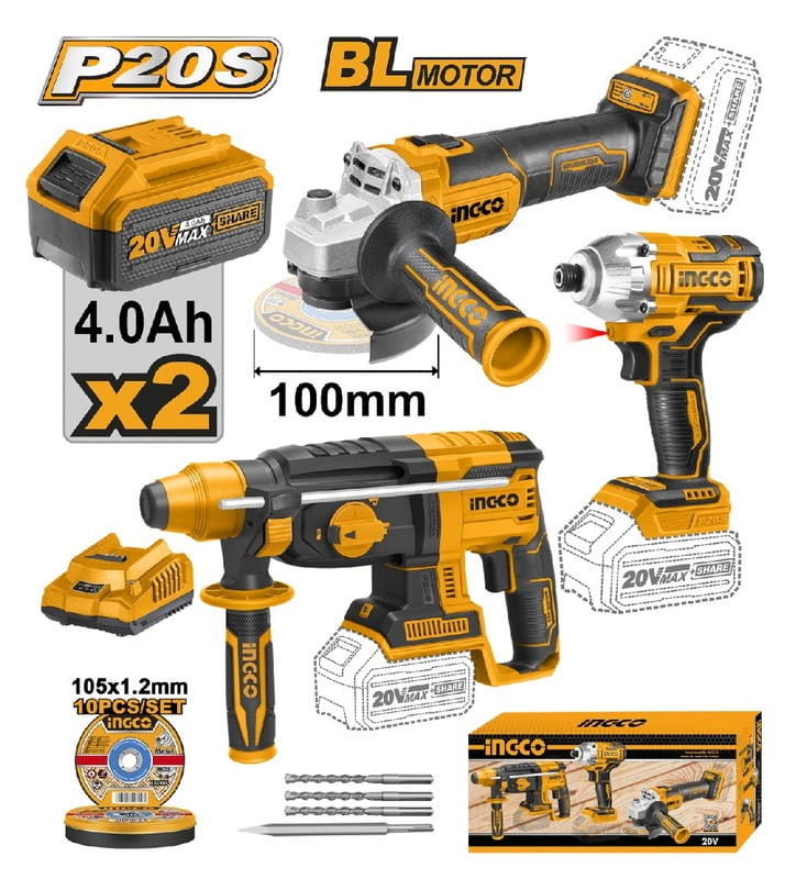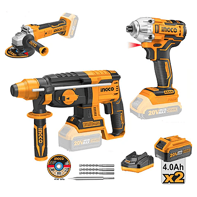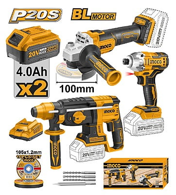 "Voltage: 20V 1 Pcs Lithium-Ion rotary hammer(CRHLI202287) 1 Pcs Lithium-Ion angle grinder(CAGLI201008) 1 Pcs Lithium-Ion impact driver(CIRLI2017) Lithium-Ion rotary hammer(CRHLI202287): Brushless motor Voltage: 20V No-load speed: 0-1100rpm Impact rate: 0-5000bpm Single impact force: 2.0J Max.drilling capacity: Concrete: 26mm Steel: 13mm Wood: 30mm Integrated work light SDS plus chuck system Lithium-Ion angle grinder(CAGLI201008): Brushless Motor Voltage: 20V No-load speed: 3000/8500rpm Disc diameter: 100mm Spindle thread: M10 Lithium-Ion impact driver(CIRLI2017): Brushless motor Voltage: 20V Hex shank: 6.35mm No-load speed: 0-1300/0-2300rpm Impact rate: 0-2000/0-3300bpm Max torque: 170Nm Include: 1 Set abrasive metal cutting disc set 3 Pcs drills 1 Pcs chisel 2 Pcs 4.0Ah battery pack(FBLI2002) 1 Pcs charge(FCLI2001) Charge volts:220-240V~50/60Hz Packed by color box"