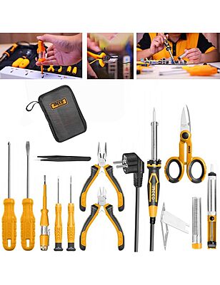 13 Pcs Telecom Tools set 220-240V~50/60Hz Include: 1 Pcs 4.5" Long nose pliers 1 Pcs 4.5" Diagonal cutting pliers 1 Pcs Slotted screwdriver SL5.5x100mm 1 Pcs Phillips screwdriver PH1x100mm 1 Pcs Precision screwdriver PH000x50mm 1 Pcs Precision screwdriver SL2.0x50mm 1 Pcs 5.5" Electrician's Scissors 1 Pcs 40w Electric Soldering Iron 1 Pcs Electric Soldering Iron bracket 1 Pcs 6" Soldering wire 1 Pcs Vacuum desoldering pump 1 Pcs Tweezers 125mm 1 Pcs Test pencil 140mm Packed by canvas bag