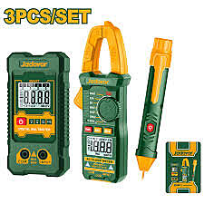 3pcs/set, including as follow: 1pcs digital AC clamp meter(JDDM6501) Display:True RMS 2000counts AC Current:2A/20A/200A AC Voltage:2V/20V/200V/600V DC Voltage:200mV/2V/20V/200V/600V Resistance: 200Ω/2kΩ/20kΩ/200kΩ/2MΩ/20MΩData Hold Diode test date hold 1pcs digital multimeter(JDDM1501) Display:True RMS 2000 counts Smart Function DC Voltage 0.8~600V AC Voltage: 0.8~600V Resistance range: 600kΩAuto Range 1pcs AC voltage detector(JDTP3503) AC Voltage: 70~1000V Frequency: 50/60Hz Alarm mode: sound and light alarmFlash light: white LED With 1pcs Test lead With 6pcs R03 AAA batteries Packed by double blister